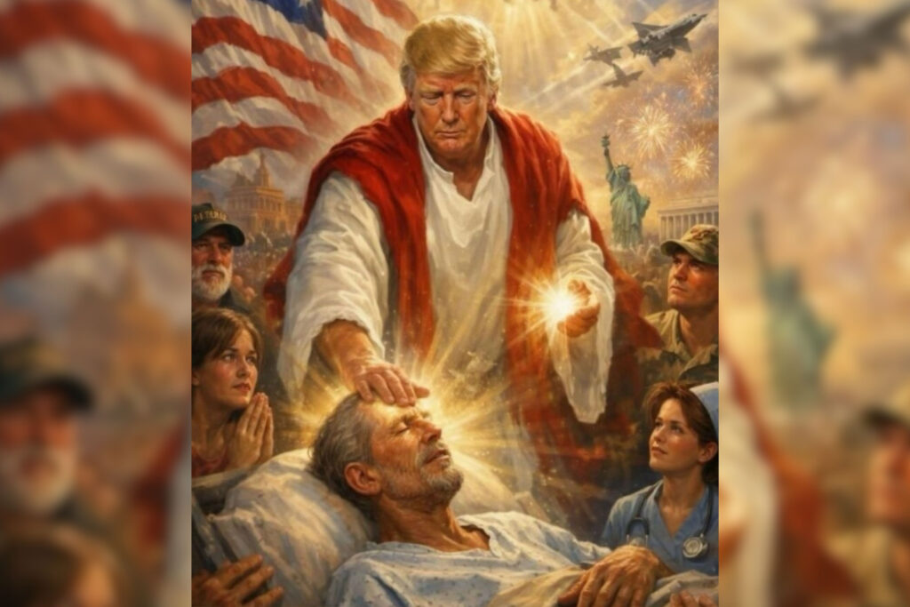 Apenas 46 minutos después de su ataque al Papa, Trump publicó una imagen generada por inteligencia artificial que lo mostraba con una túnica blanca y un chal rojo, rodeado de un soldado, una enfermera y una mujer rezando, mientras posaba sus manos sobre un hombre enfermo en una clara alusión a la iconografía de Jesucristo.